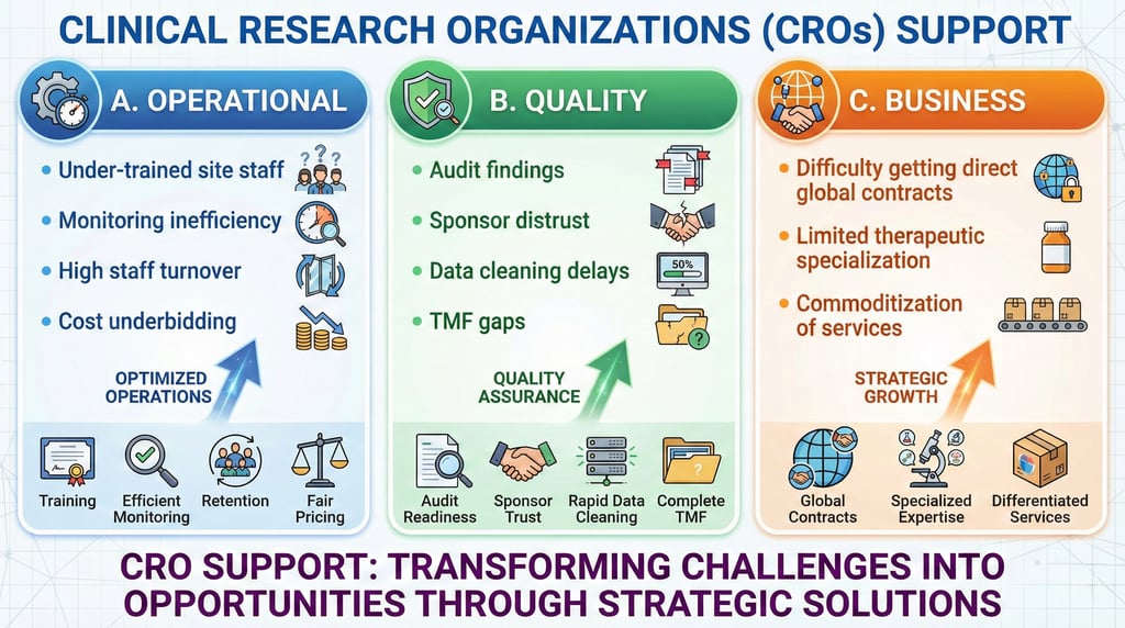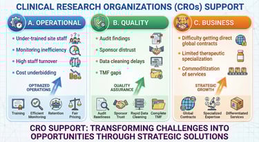 The pharmaceutical and clinical research ecosystem operates through three critical pillars — Sponsors (Pharmaceutical Companies), CROs, and Clinical Trial Sites (Hospitals & Academic Institutions). While each plays a vital role in drug development, operational silos, compliance variability, and misaligned execution models often lead to delays, regulatory setbacks, cost overruns, and data quality risks.